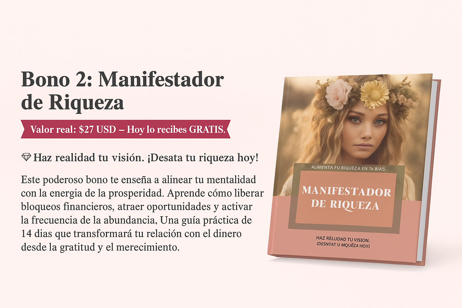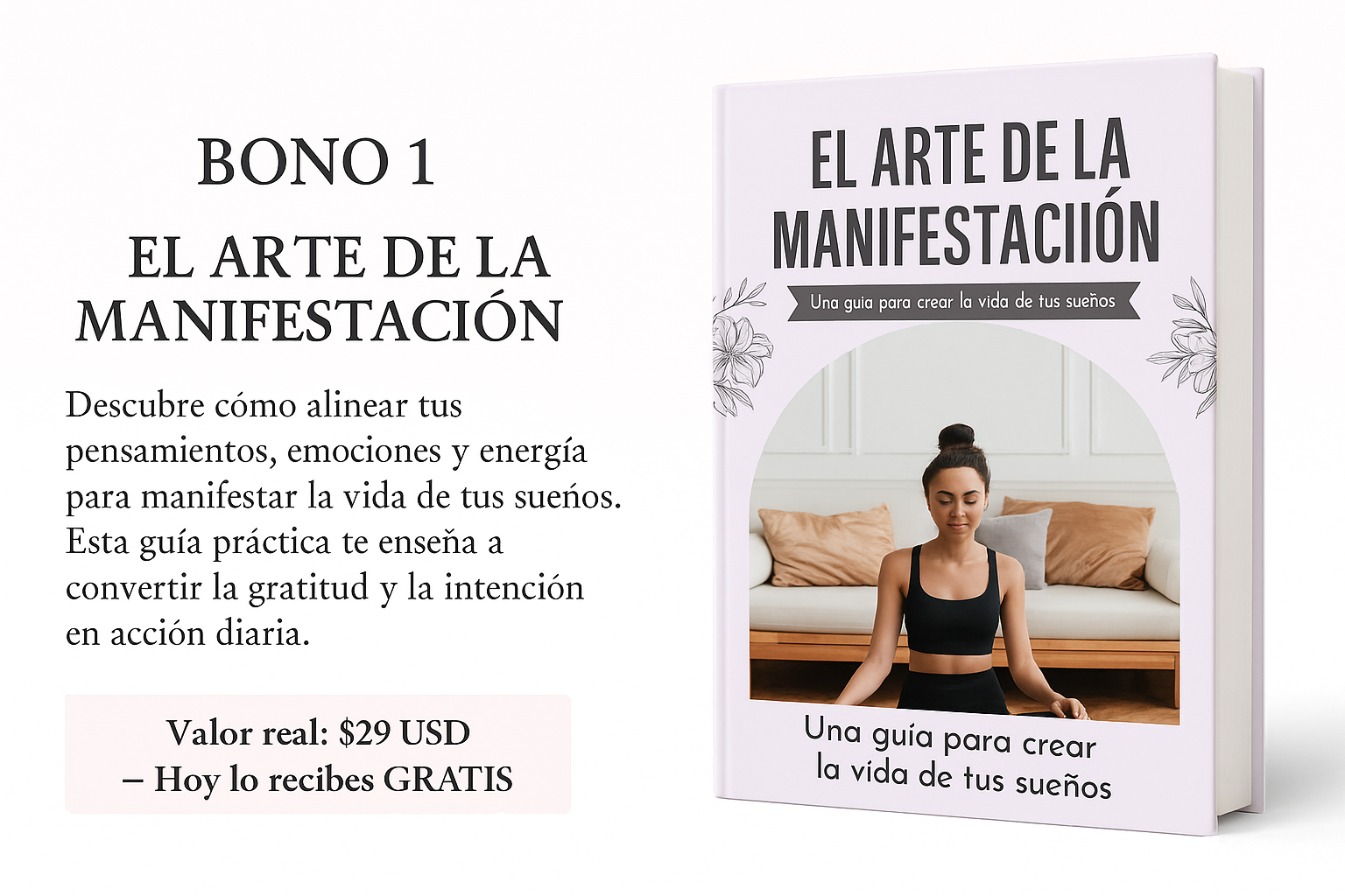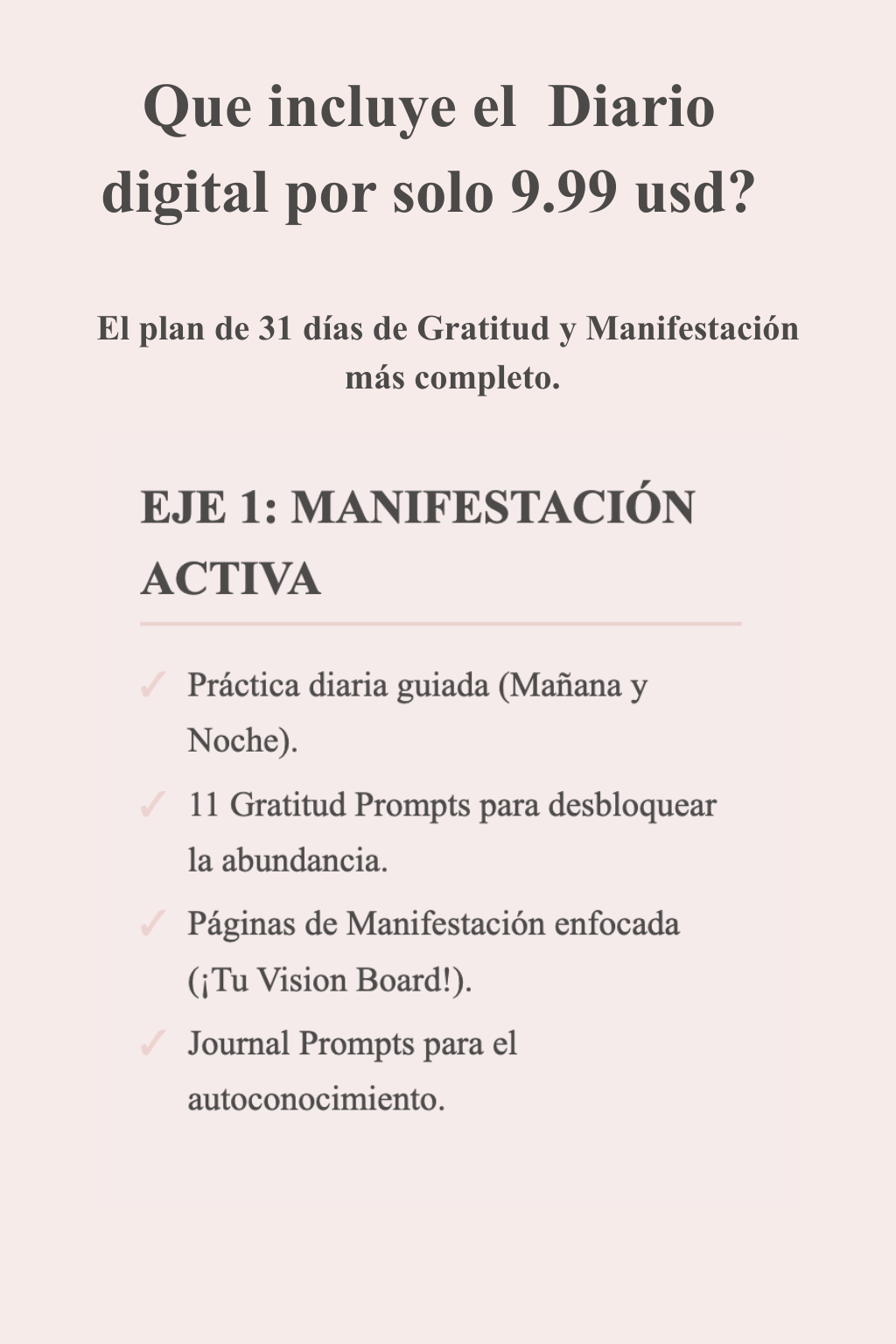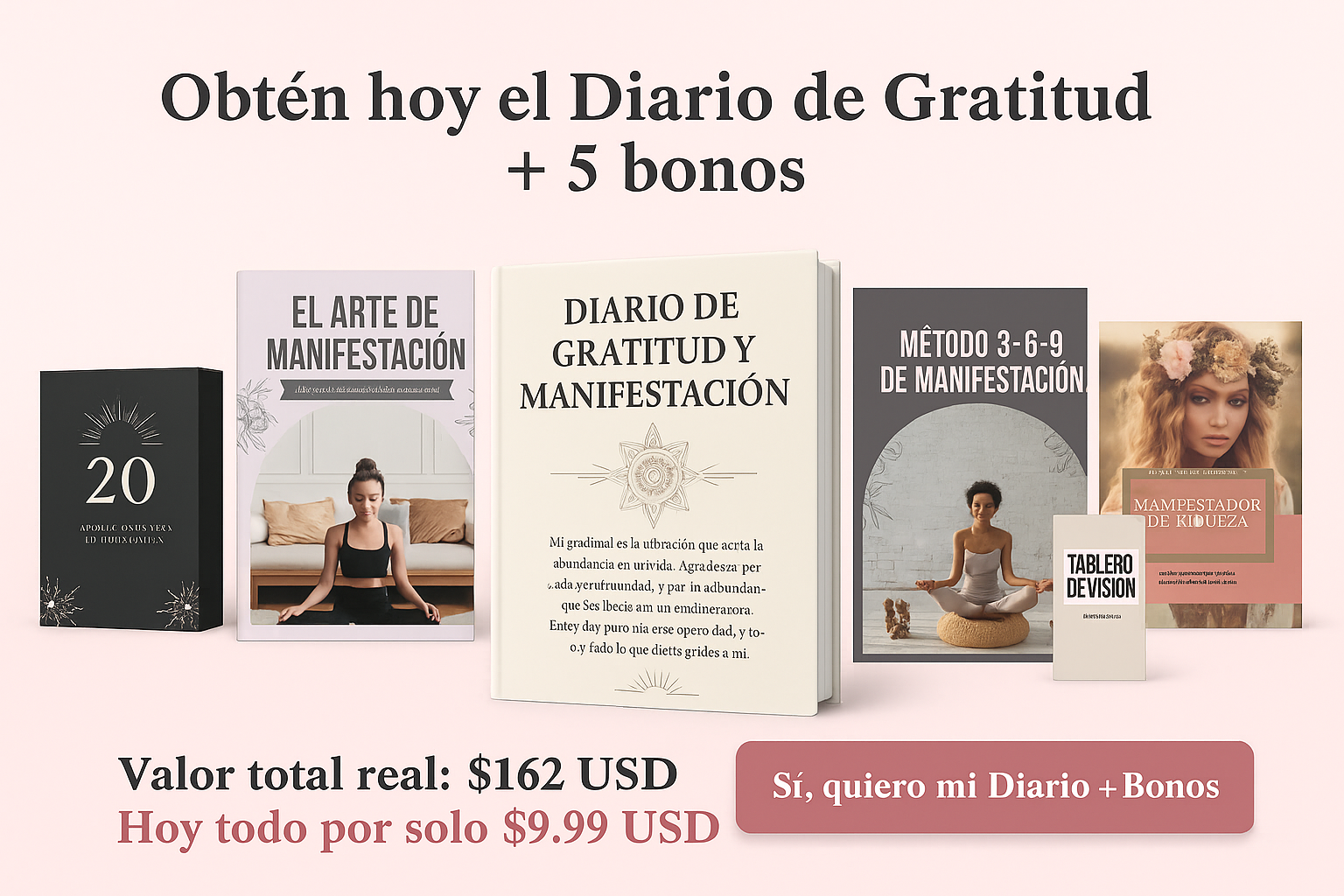 El valor real del paquete es $162 USD, pero hoy obtienes pel DIARIO DE GRATITUD Y MANIFESTACION + 5 BONOS por solo $9.99 USD.