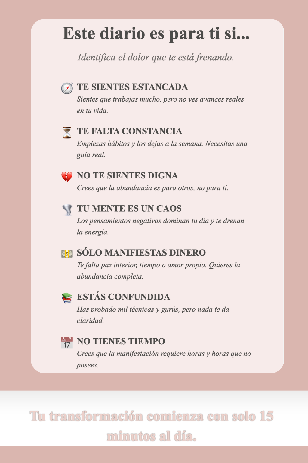 Este no es un cuaderno más. Es un portal hacia una vida más plena, abundante y consciente. Cada página fue creada para ayudarte a elevar tu vibración, entrenar tu mente en la gratitud diaria y enfocar tu energía en lo que verdaderamente deseas manifestar.